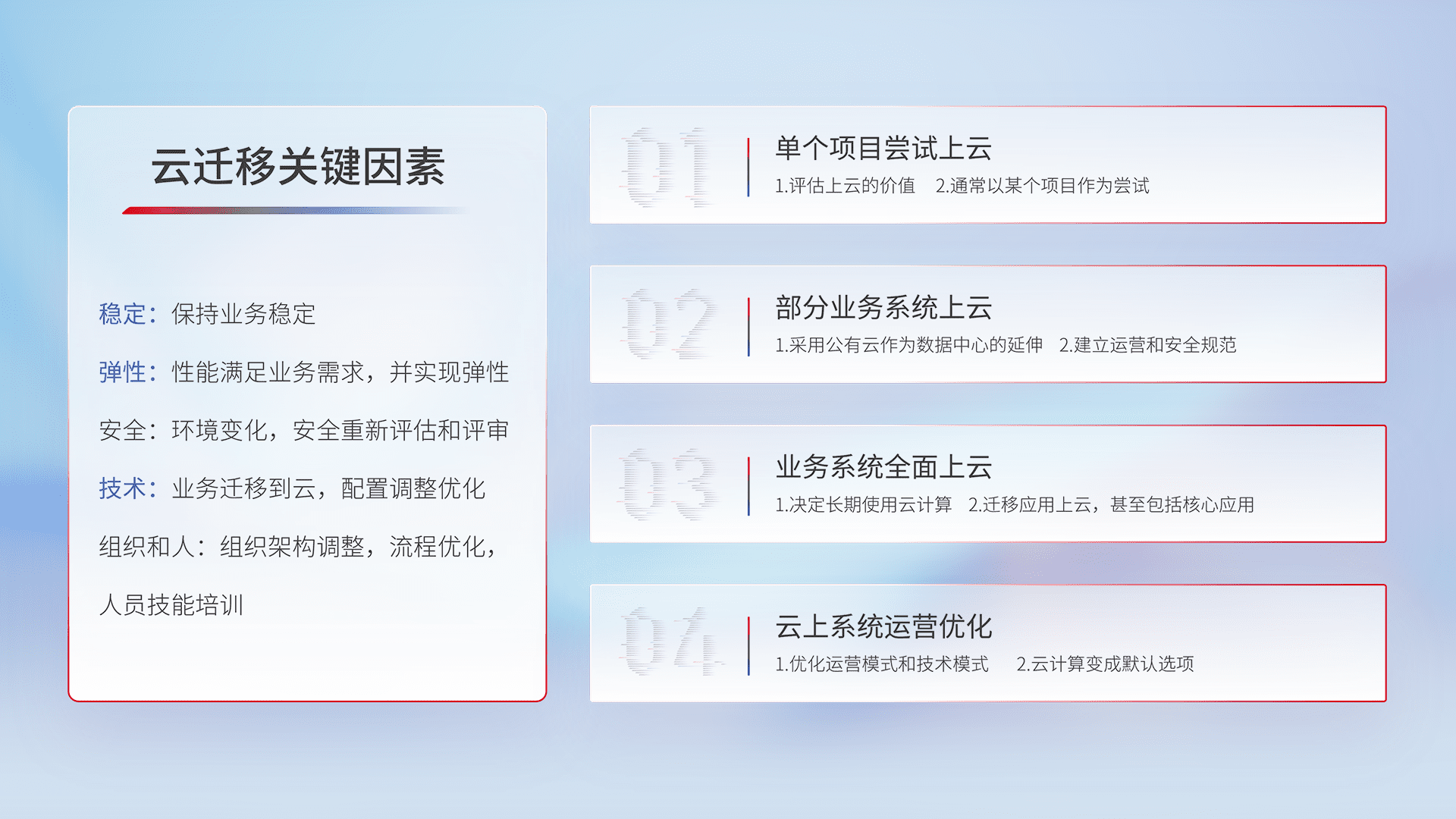 结合实际业务,,,从规划设计、、、云平台选型、、云原生改造、、、数据迁移、、、、集成交付,,迁移全过程为客户识别最佳上云路径,,,,做好风险识别管理,,设计网络架构、、身份权限、、、安全审计合规、、操作审计、、、、日志审计、、、监控告警策略、、多站点容灾设计等,,,对云上基础设施进行整体规划,,,,提升IT治理水平,,以满足弹性、、、、高可用、、、、高性能的需求。。。。